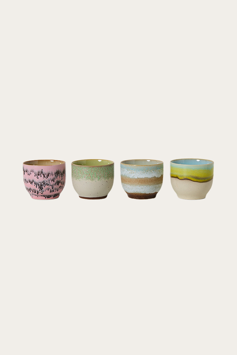 70s ceramics café cups deco er et kreativt og uttrykksfullt sett med fire kopper inspirert av kunstretninger som pop art og abstrakte former. De håndmalte detaljene og teksturerte glasurene gir hver kopp et unikt preg, perfekt for kaffeøyeblikk med personlighet.