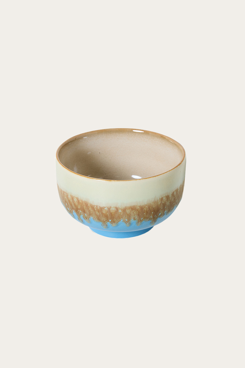 70s ceramics noodle bowl azure er en dekorativ skål med et unikt fargespill inspirert av rå kystlinjer og naturlige overflater. Den håndlagde følelsen og de levende glasurene gir et avslappet og moderne uttrykk, perfekt til servering av nudler, supper eller småretter.