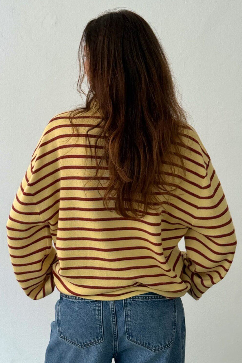 Adanne stripe polo er en kul og avslappet strikket topp med et varmt stripemønster i gule og rustfargede toner. Den oversized passformen gir et uanstrengt uttrykk, mens bomullskvaliteten gjør den komfortabel og perfekt til hverdagsbruk.