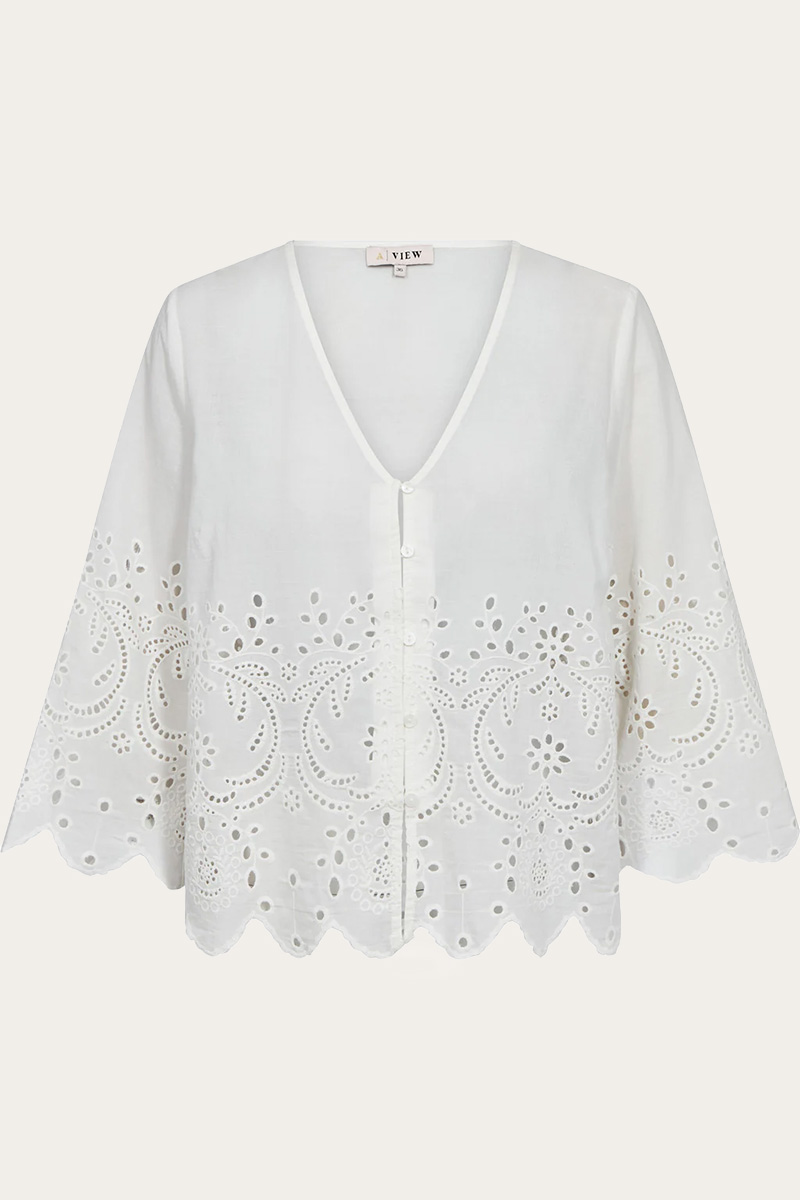 Aiana blouse er en romantisk og luftig bluse med delikate broderte detaljer som gir et feminint preg. Den åpne halsen og den løse passformen gjør den både behagelig og flatterende, perfekt til sommerens antrekk.