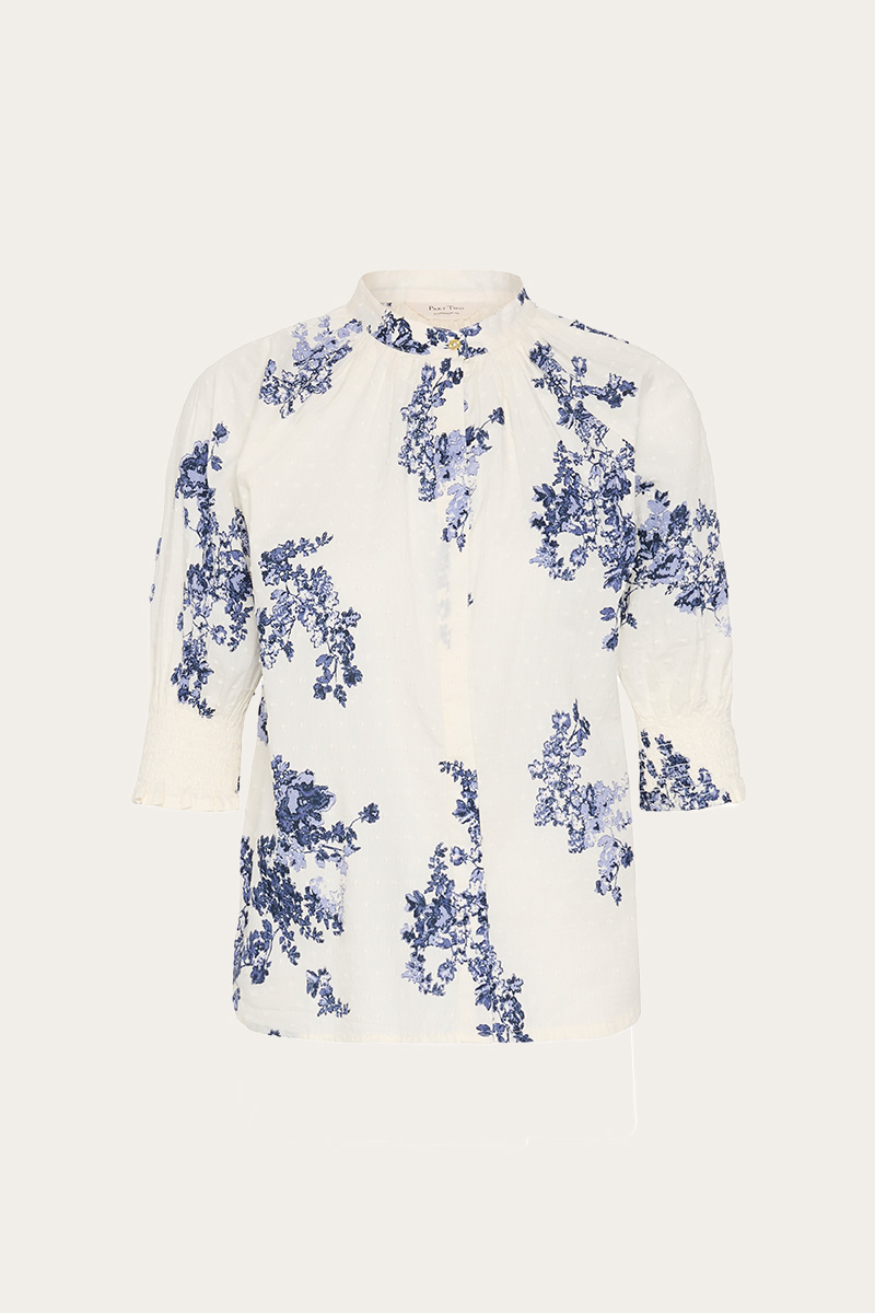 AlmerasPW Shirt fra Part Two er en feminin bluse med et vakkert blomsterprint i blåtoner. Den har en avslappet passform og en elegant knytedetalj i halsen som gir et sofistikert preg. De albuelange ermene avsluttes med smockede mansjetter, mens den myke bomullskvaliteten gir et lett og moderne uttrykk.