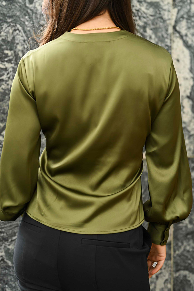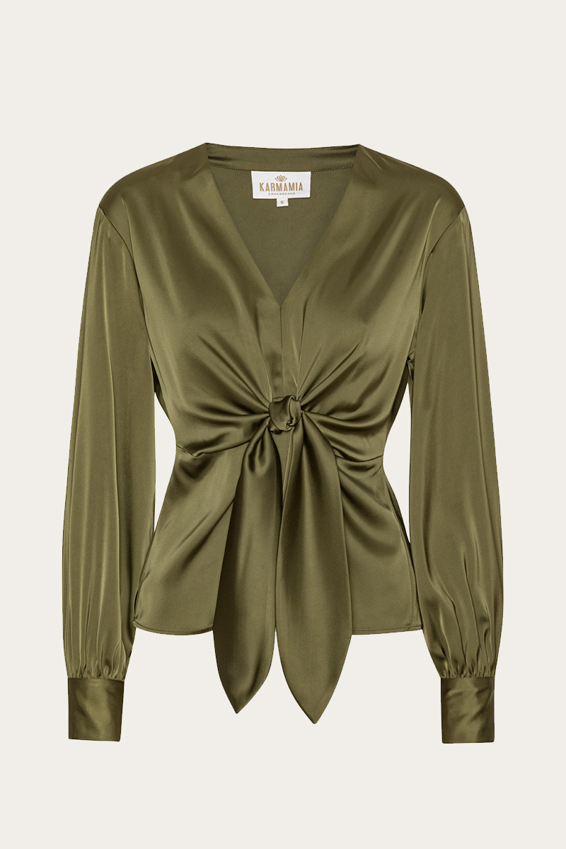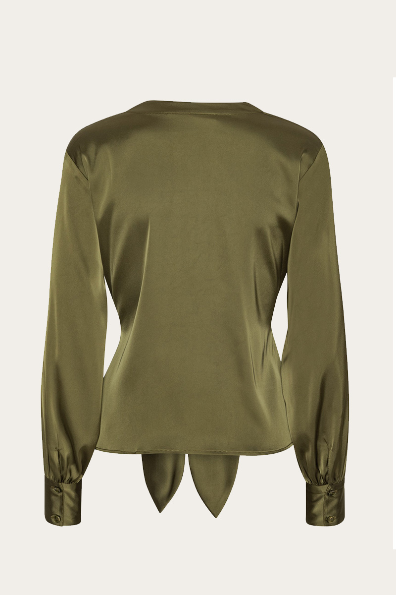 Blair Blouse i olive er en stilfull bluse laget i semimatt sateng som gir et eksklusivt uttrykk. Den har V-hals med knyting foran og en løs, feminin fasong som gjør den enkel å style til både jeans, skjørt og dressbukser.