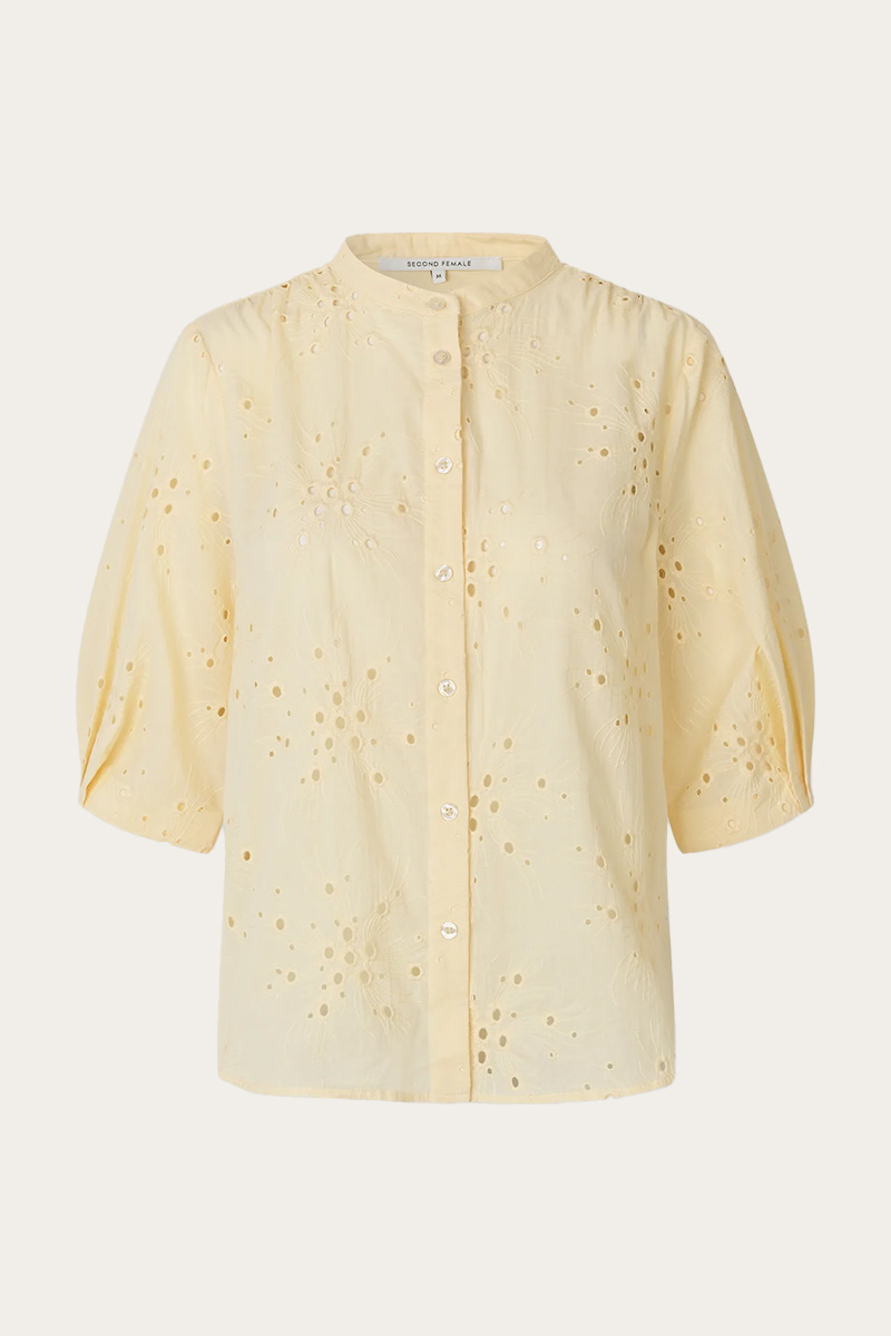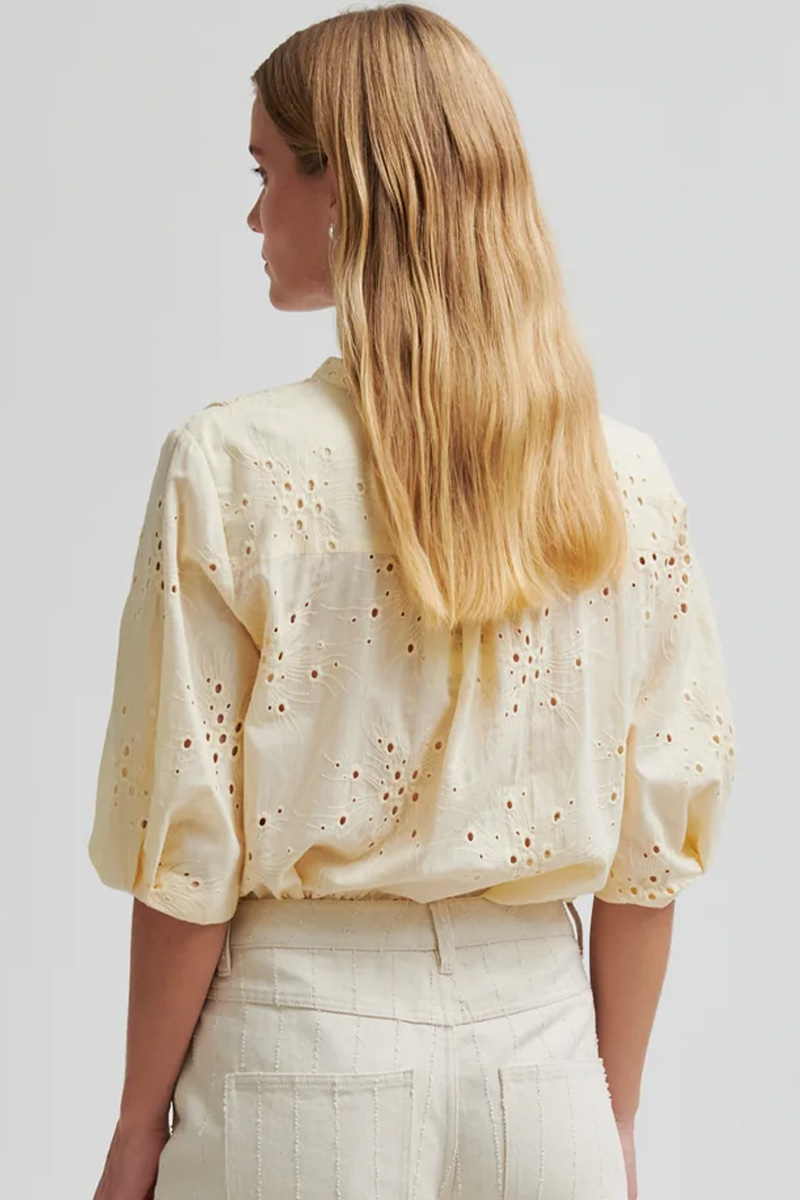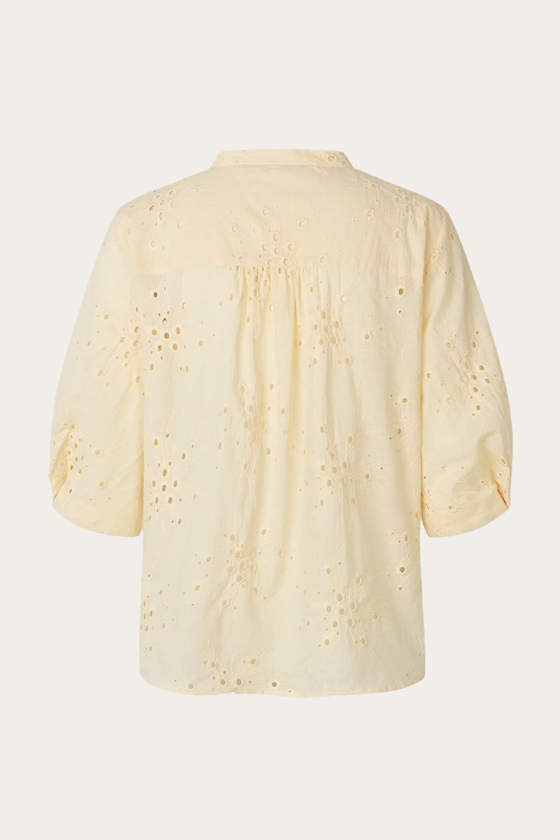 Cavana t-shirt er en lett og feminin topp i myk bomull med dekorative broderidetaljer. Den rene silhuetten kombinert med fine legg og oppbrettede ermer gir et moderne og sommerlig uttrykk.