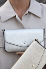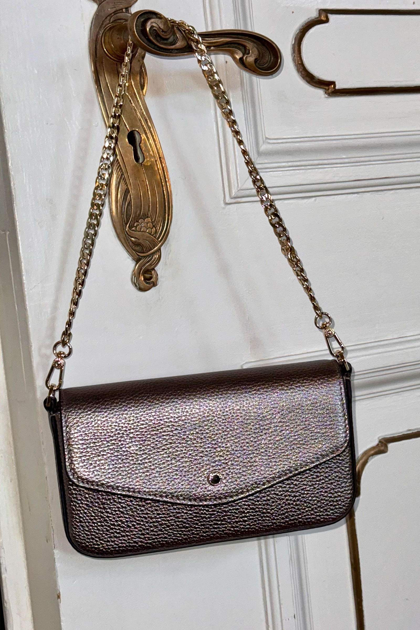 Lekker liten håndveskeveske i metallisk bronse fra Pourchet Paris i kalveskinn. Club har en kortere avtagbar gullenke og et hovedrom med ulike oppbevaringslommer som kan romme kort, valuta og papirer. Kommer med en ekstra lengere skinnrem. En perfekt veske til partyantrekket! Du finner vesker fra Pourchet Paris i våre Companysbutikker og på Companys.no