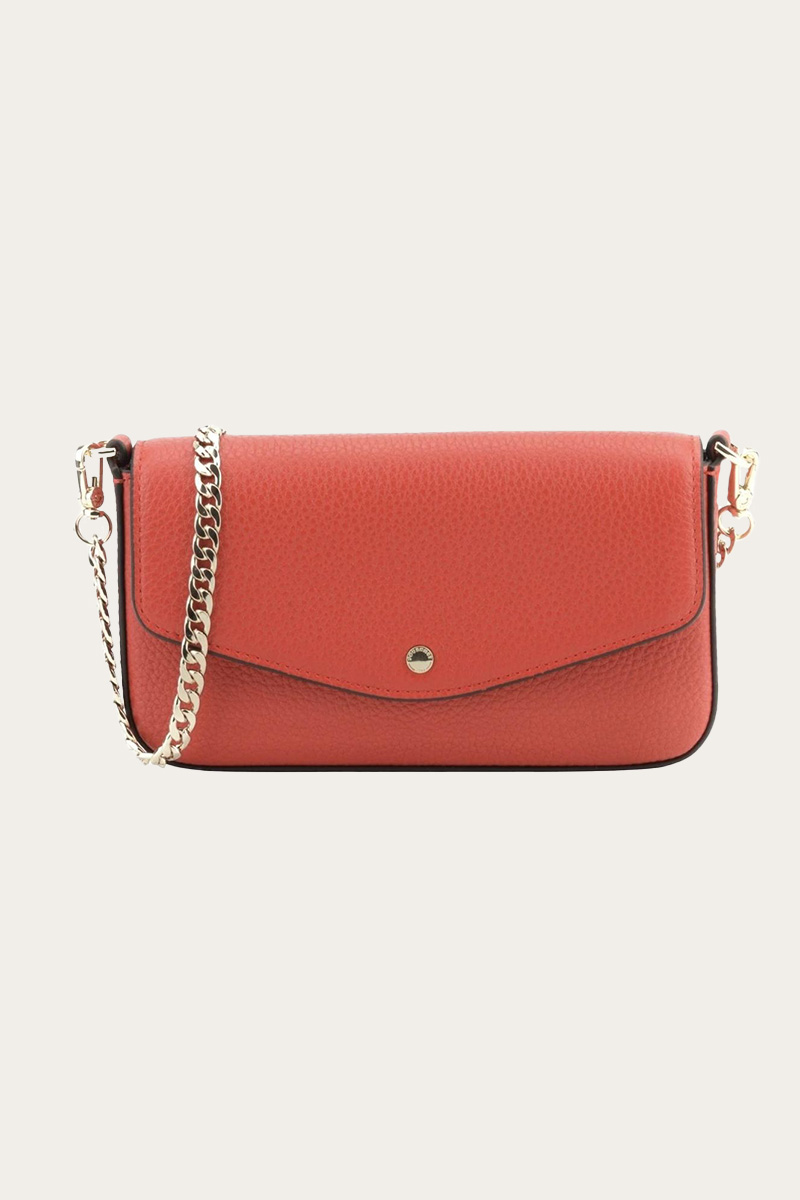 Denne lekre håndvesken fra Pourchet Pari kombinerer eleganse og funksjonalitet. Den kommer med en kort, avtagbar gullenke samt en lengre, justerbar skinnrem for fleksibel bruk. Vesken har ett hovedrom med smarte oppbevaringslommer som gir plass til kort, kontanter og små dokumenter – perfekt for en kveld ute. Den sofistikerte fargen rouge gir et stilig løft til ethvert partyantrekk.