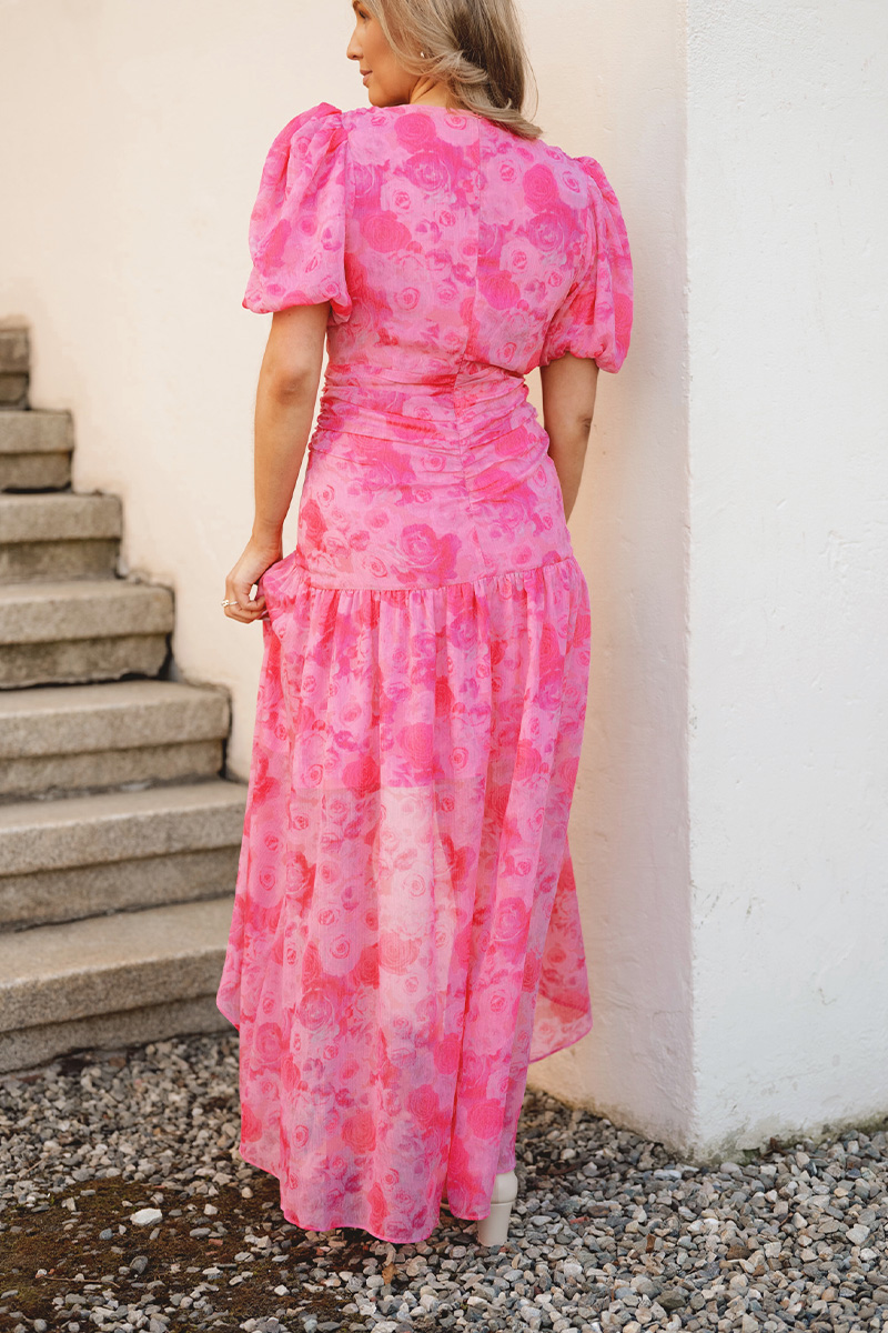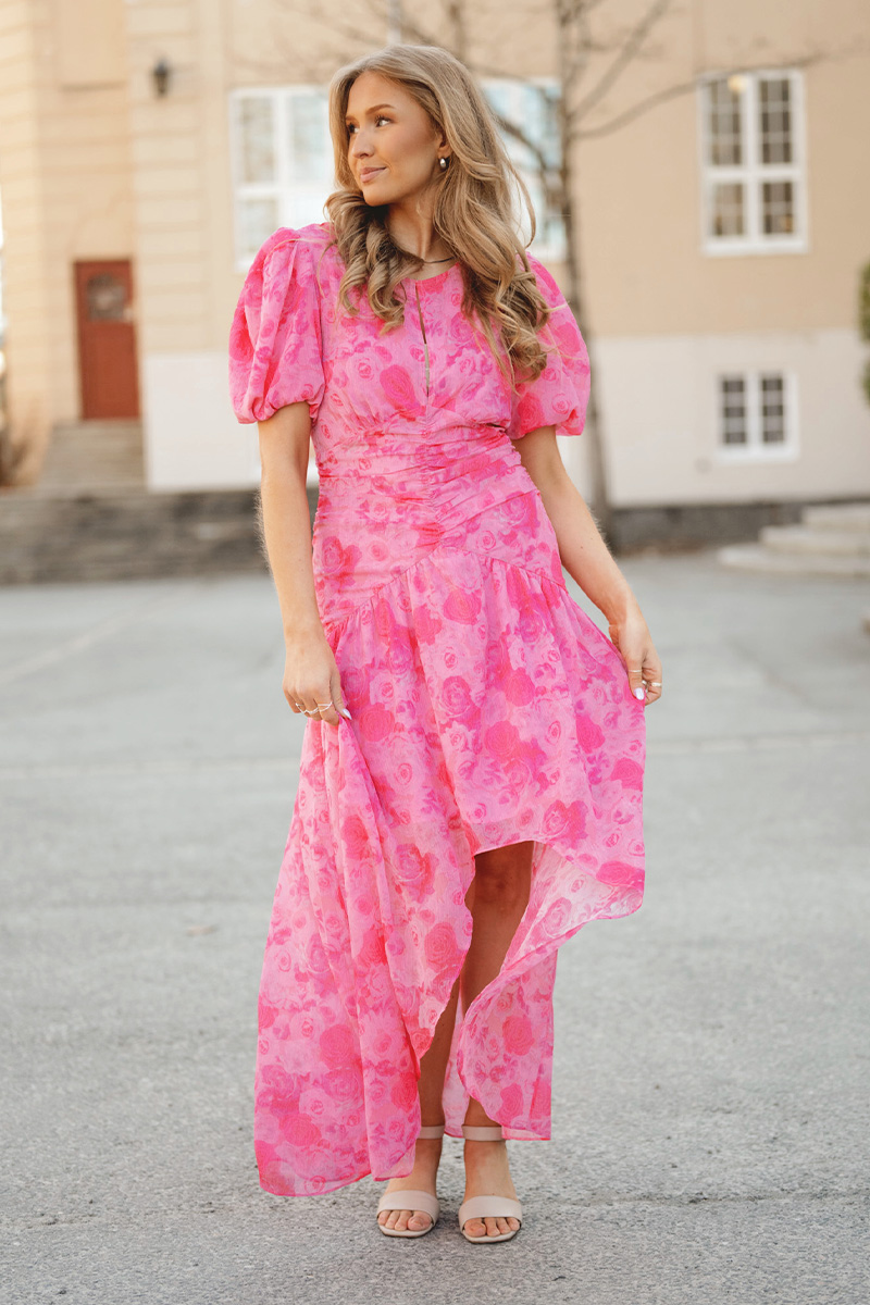 Elainecras dress er en feminin maxikjole i lett chiffon med et vakkert og blikkfangende rosemønster. Den luftige kvaliteten og det subtile skimmeret gir et elegant uttrykk, mens den draperte midjen og puffermene skaper en flatterende og moderne silhuett. Perfekt til sommerfester, bryllup og spesielle anledninger.