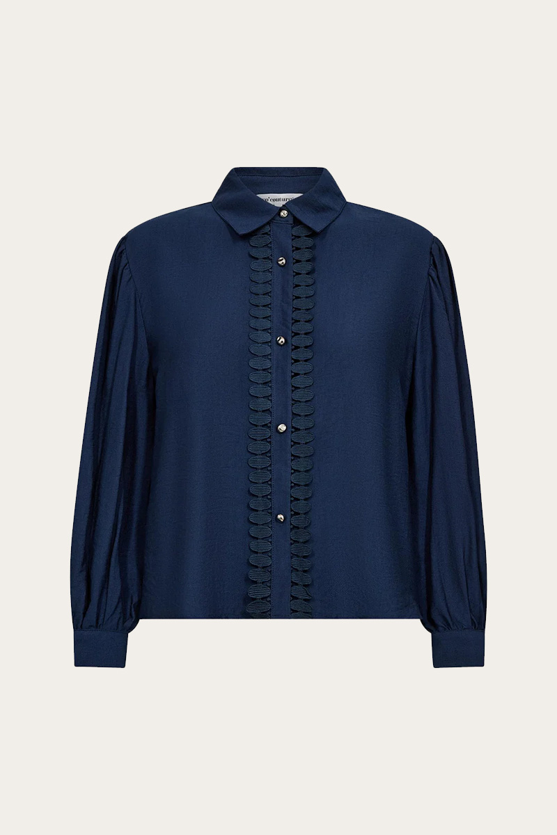 Gloria Shirt fra Co’Couture er en delikat og feminin bluse med fine detaljer som gir et sofistikert uttrykk. Den dekorative pyntekanten i knappestolpen tilfører et elegant preg, mens ermene har lett vidde som samles i en bred mansjett for en balansert silhuett. Den rette fasongen gjør blusen enkel å style både til hverdags og mer pyntede anledninger.