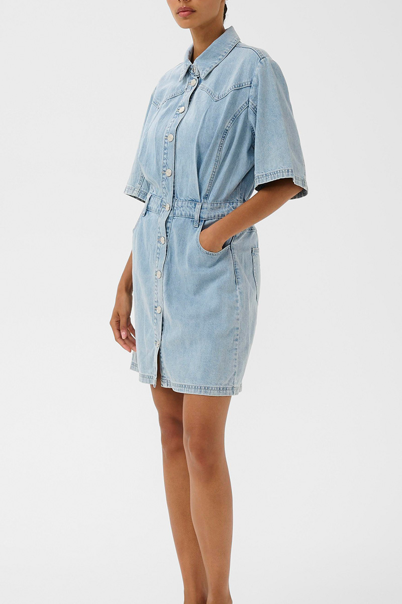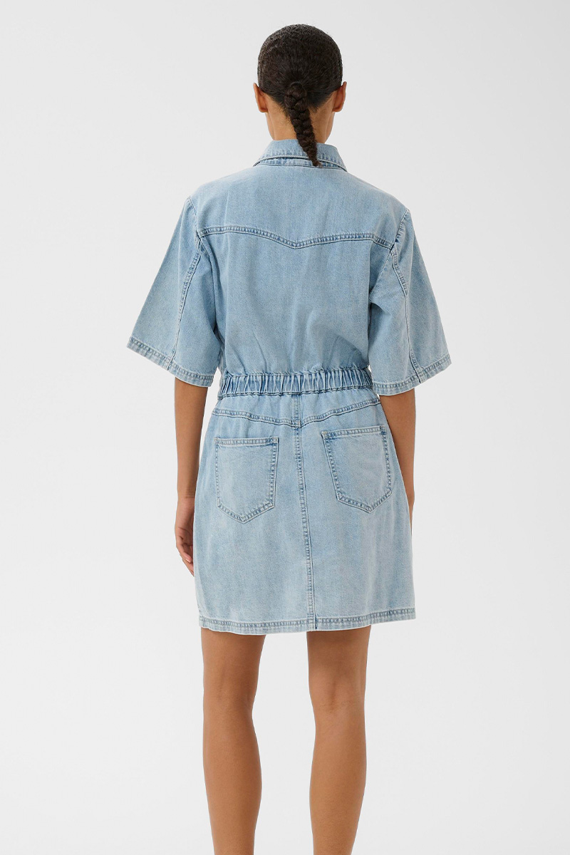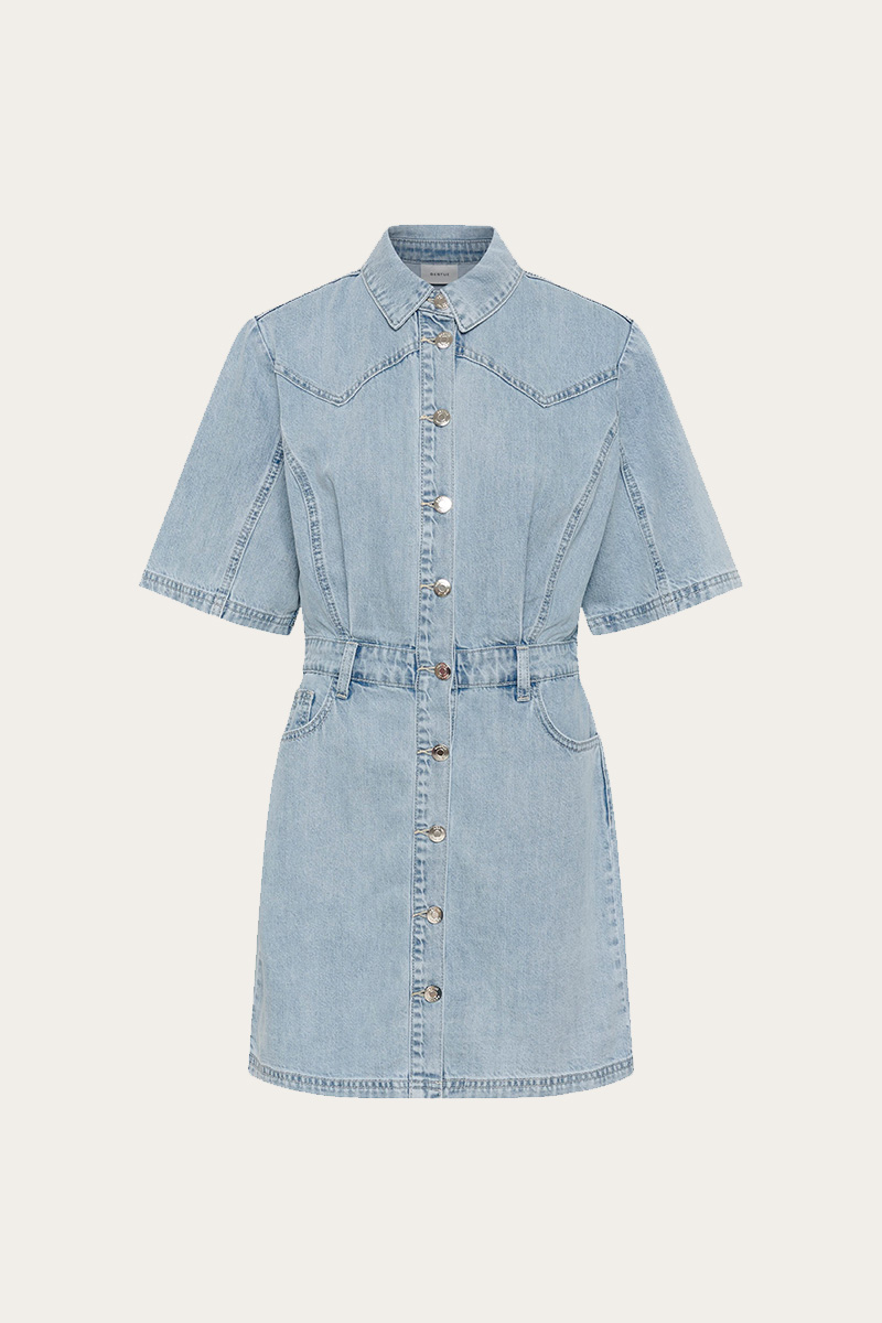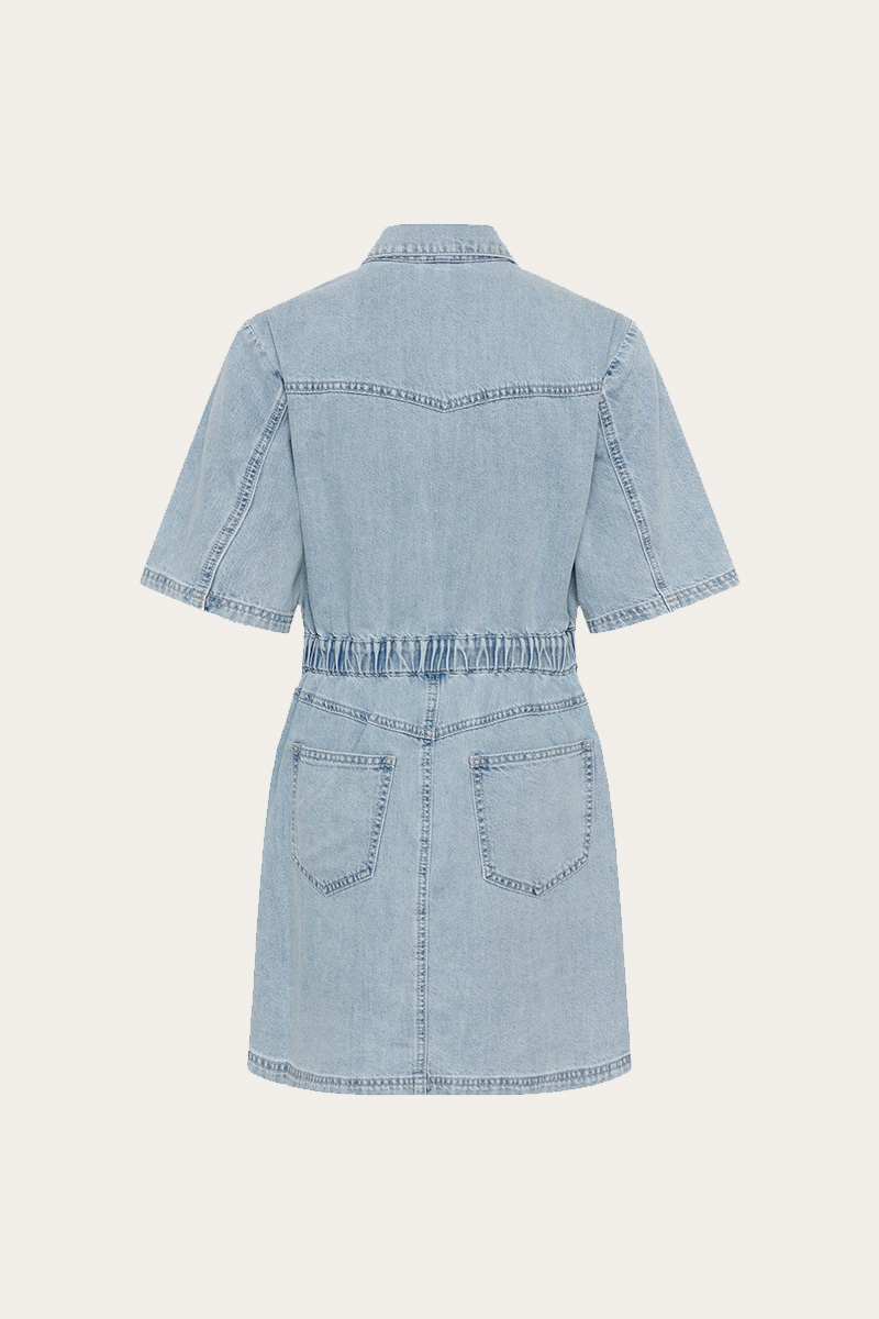 Gzmonie dress er en kul og moderne denimkjole i minilengde med et avslappet, men feminint uttrykk. Den markerte midjen og western-inspirerte sømmene gir en flatterende silhuett, mens den lyse vasken gjør kjolen perfekt til vår og sommer.