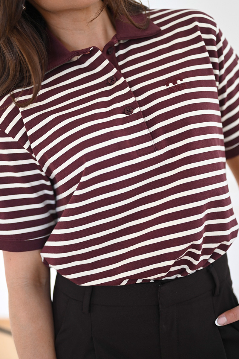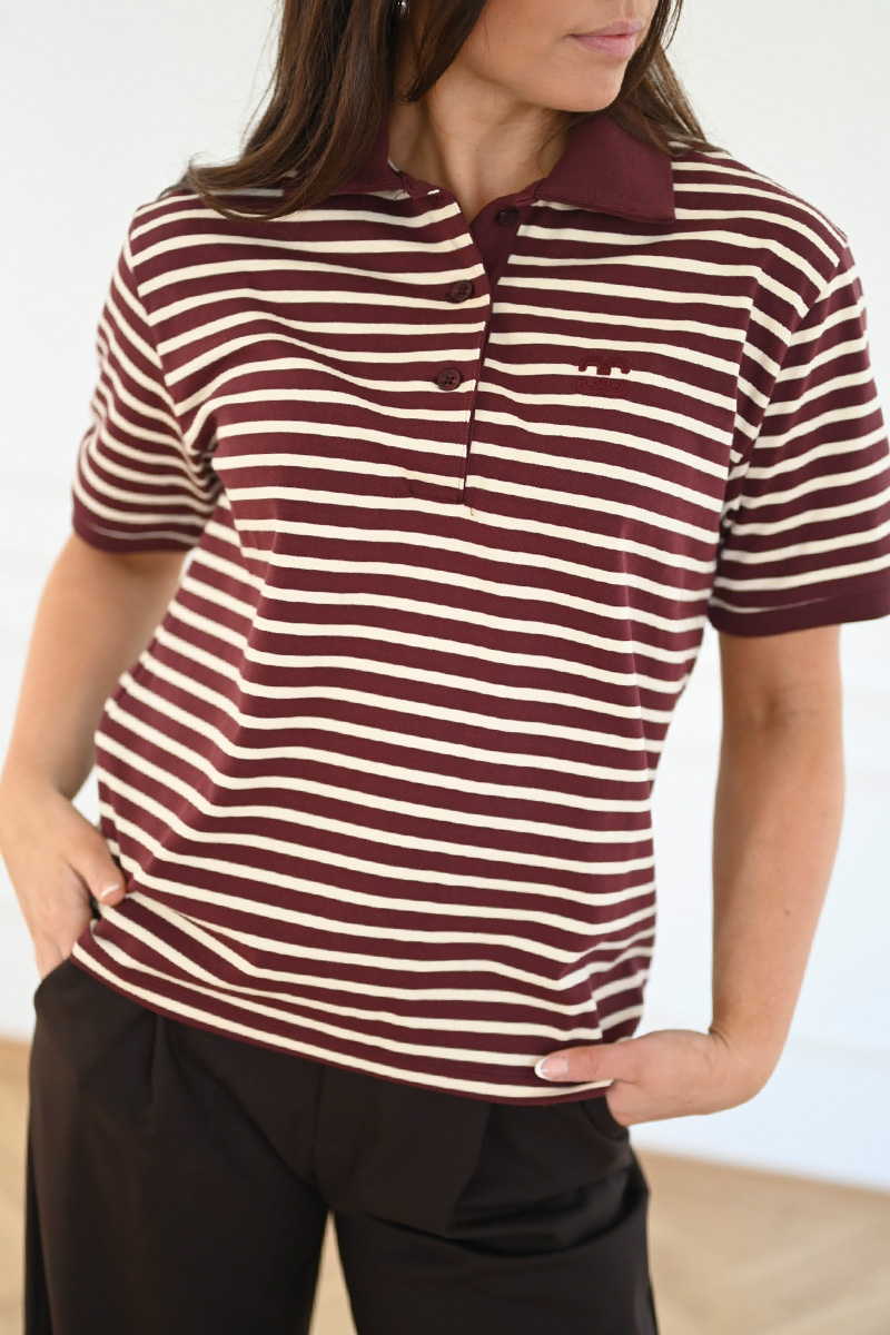 Denne polo t-skjorten fra Co’Couture kombinerer et sporty uttrykk med feminine detaljer. Den vinrøde basen med lyse striper gir et friskt og moderne preg, mens den klassiske polokragen med knapper tilfører et tidløst element. Den myke bomullsblandingen med stretch sørger for god komfort og en flatterende passform – perfekt til både jeans, skjørt og dressbukser.
