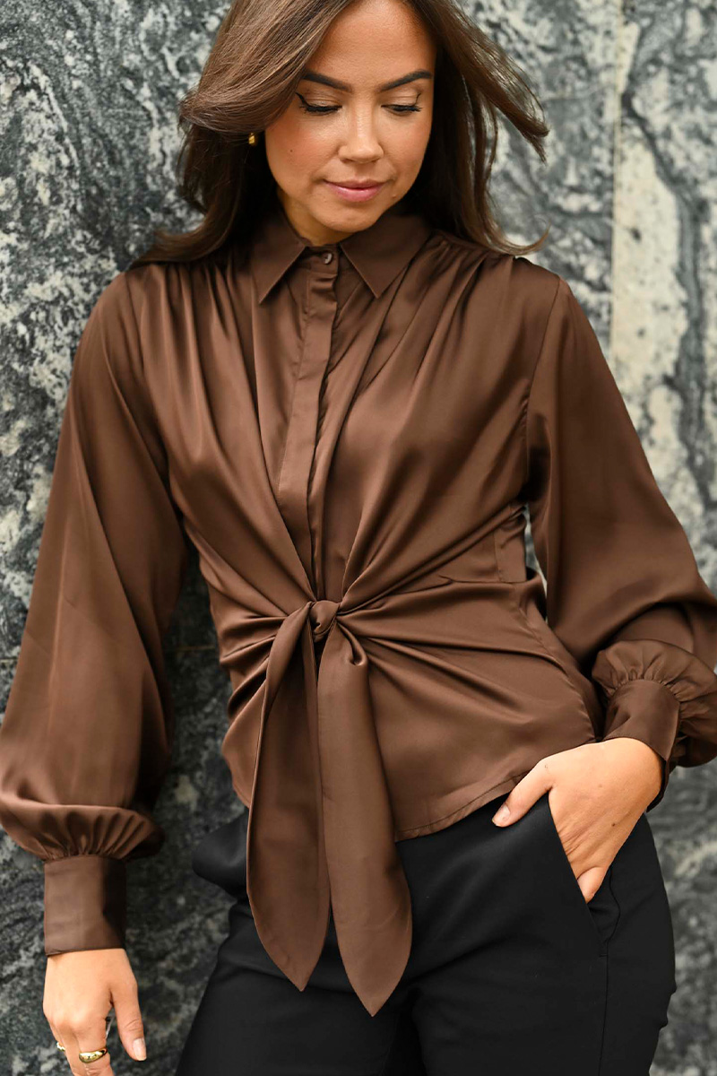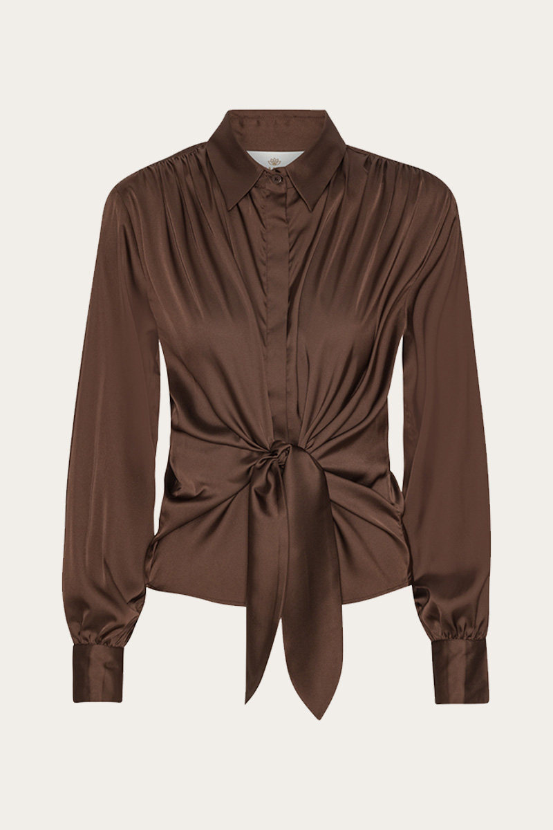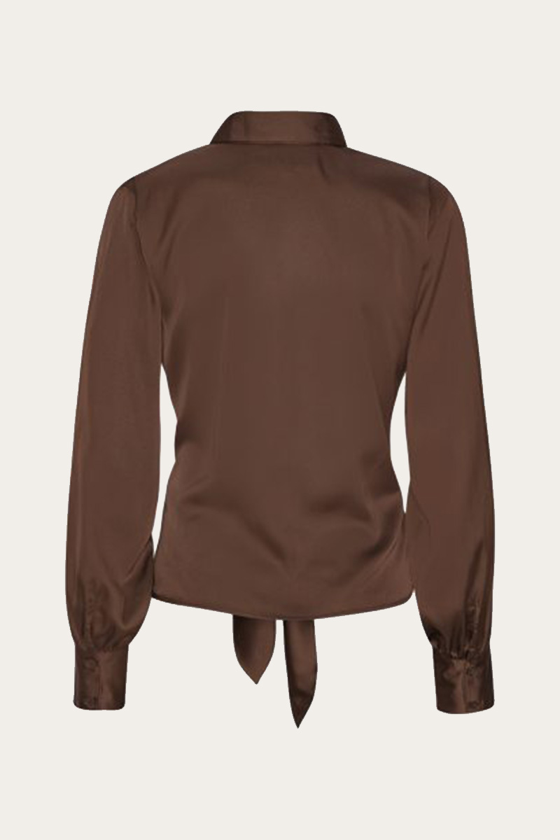 Lee Shirt i brun er en elegant skjorte med knytebånd i front som fremhever midjen. Den har klassisk krage, lange ermer og knappelukking både foran og på mansjettene. En tidløs favoritt som enkelt kan styles opp eller ned etter anledning.