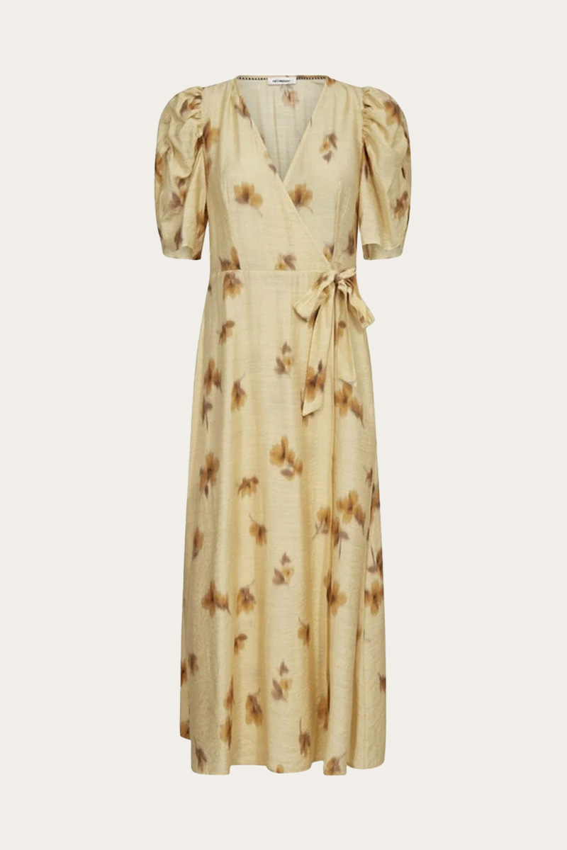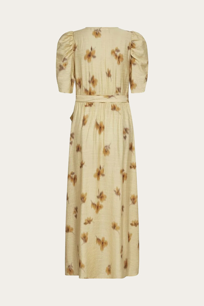 En feminin omslagskjole i en lys gul nyanse med et delikat blomsterprint. Den flatterende fasongen med knytebånd i midjen og puffede ermer gir et lett og sommerlig uttrykk, perfekt til både hverdags og fine anledninger.