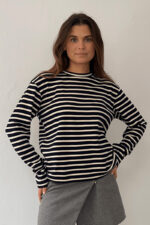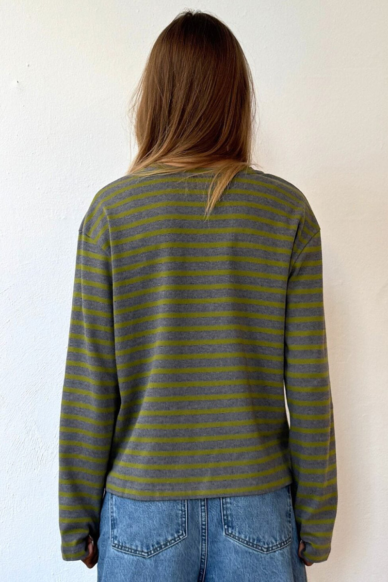 Nete stripe blouse er en myk og komfortabel bluse med et moderne stripemønster i gråmelert og grønn. Den enkle silhuetten og den behagelige bomullskvaliteten gjør den perfekt til både hverdags og avslappede antrekk.