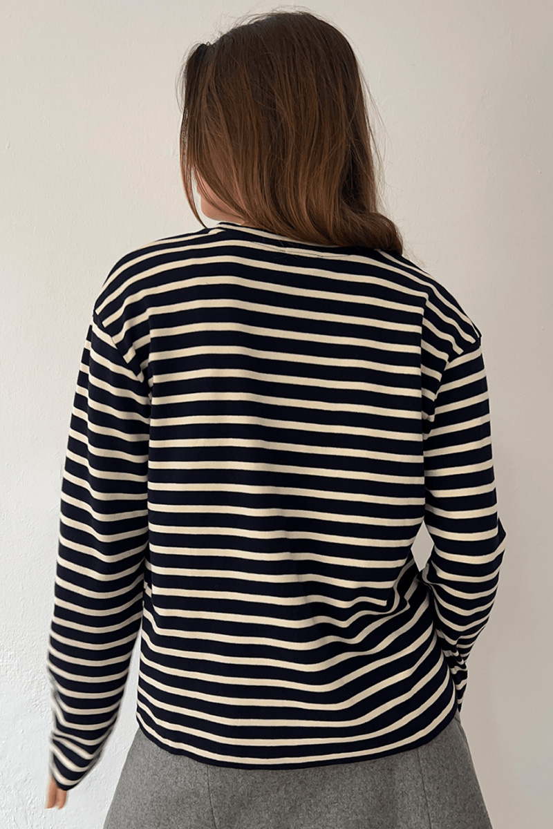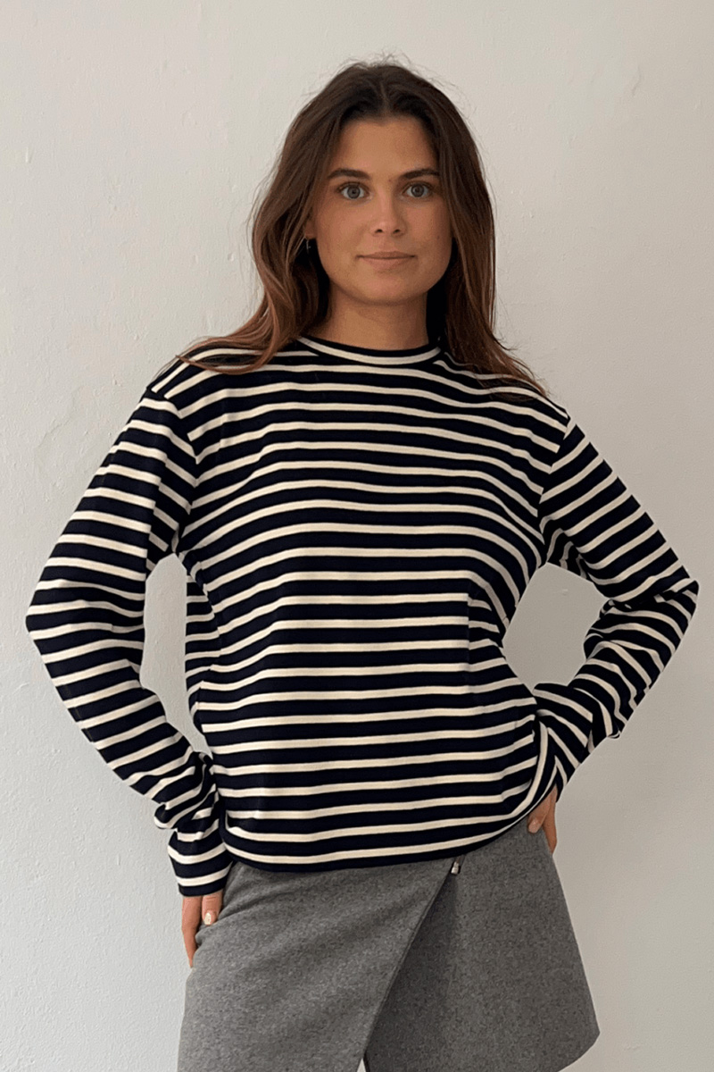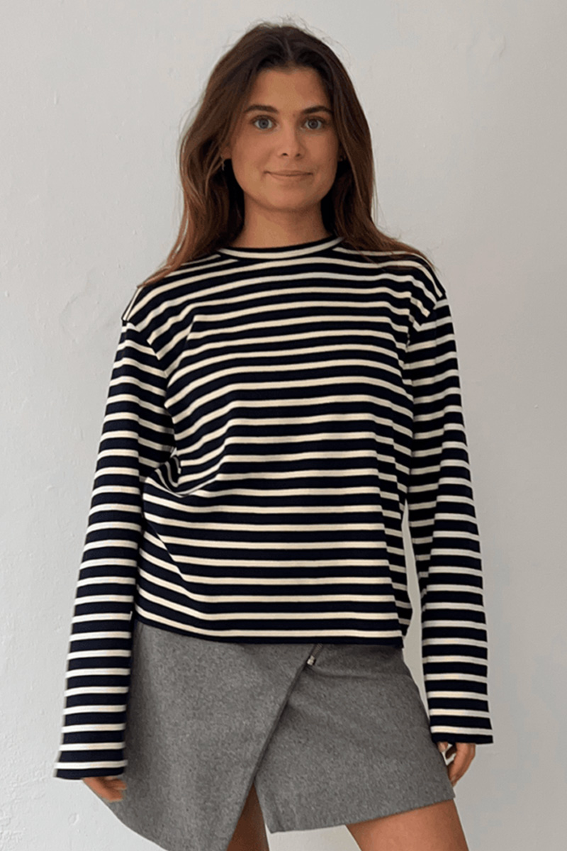Nete stripe blouse er en myk og feminin bluse med et klassisk stripemønster i navy og off white. Den enkle silhuetten og den behagelige bomullskvaliteten gjør den til en allsidig favoritt i hverdagsgarderoben.