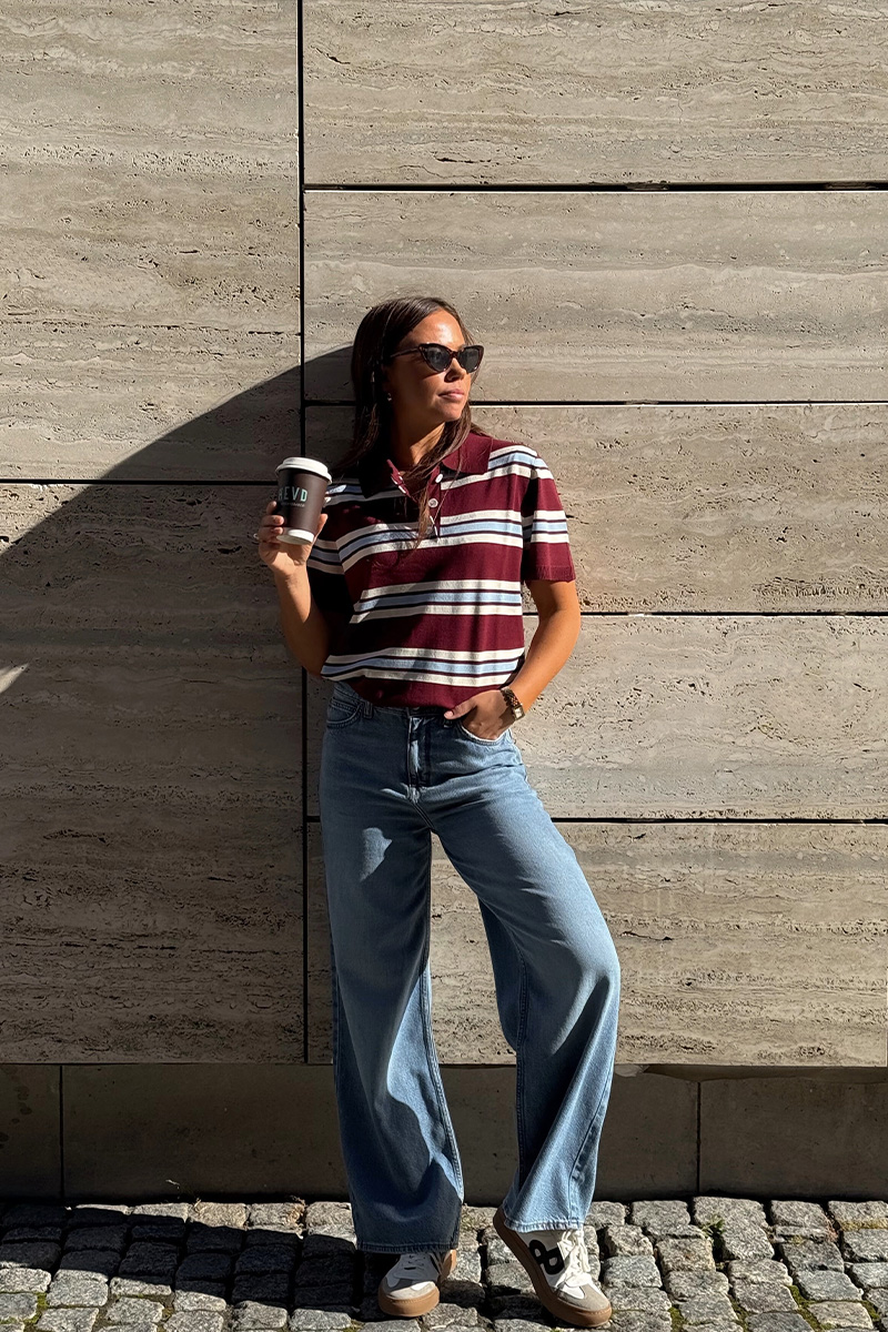 Polo Stripe Knit Blouse er en klassisk og komfortabel strikkebluse med et tidløst uttrykk. Den har korte ermer, polokrage og knappelukking i front, som gir et preppy og stilrent preg. Blusen er strikket i myk og elastisk kvalitet med horisontale striper, og har en avslappet passform som sitter pent uten å stramme. Perfekt til både jobb og hverdagsbruk – like fin til jeans som til skjørt.