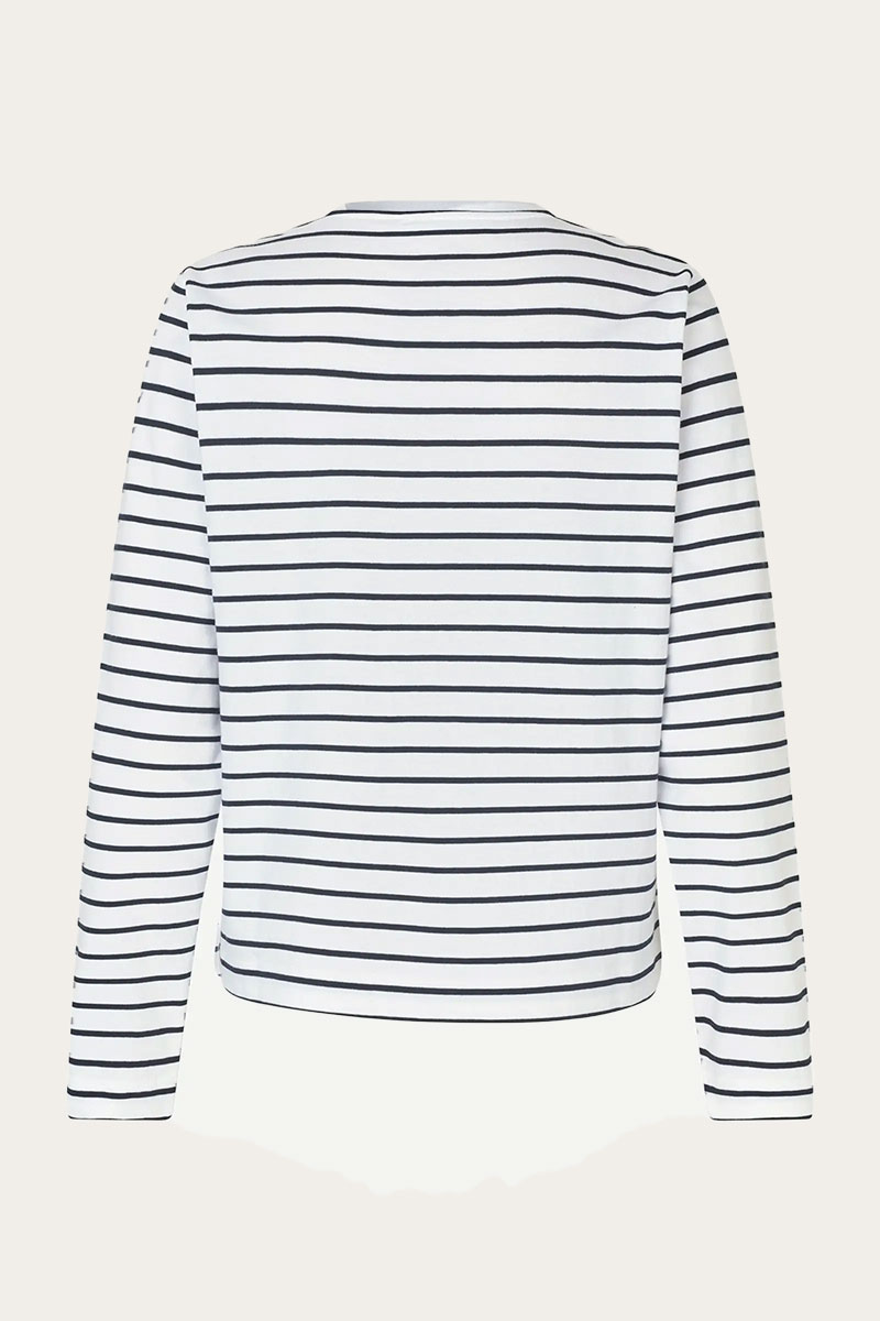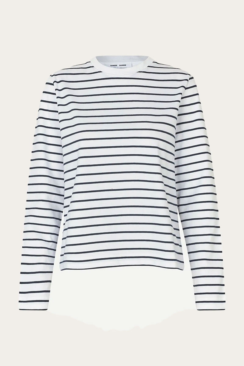 Tidløs, stripete genser fra Samsøe Samsøe! Sacamino blir en ny favoritt i basegarderoben, som er like aktuell året rundt. Genseren er laget i 100% organisk bomull som føles deilig på. Den har en vid passform, rund hals og lange ermer.