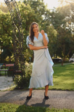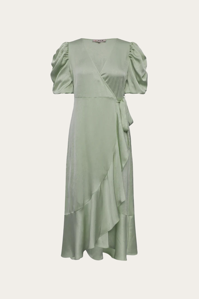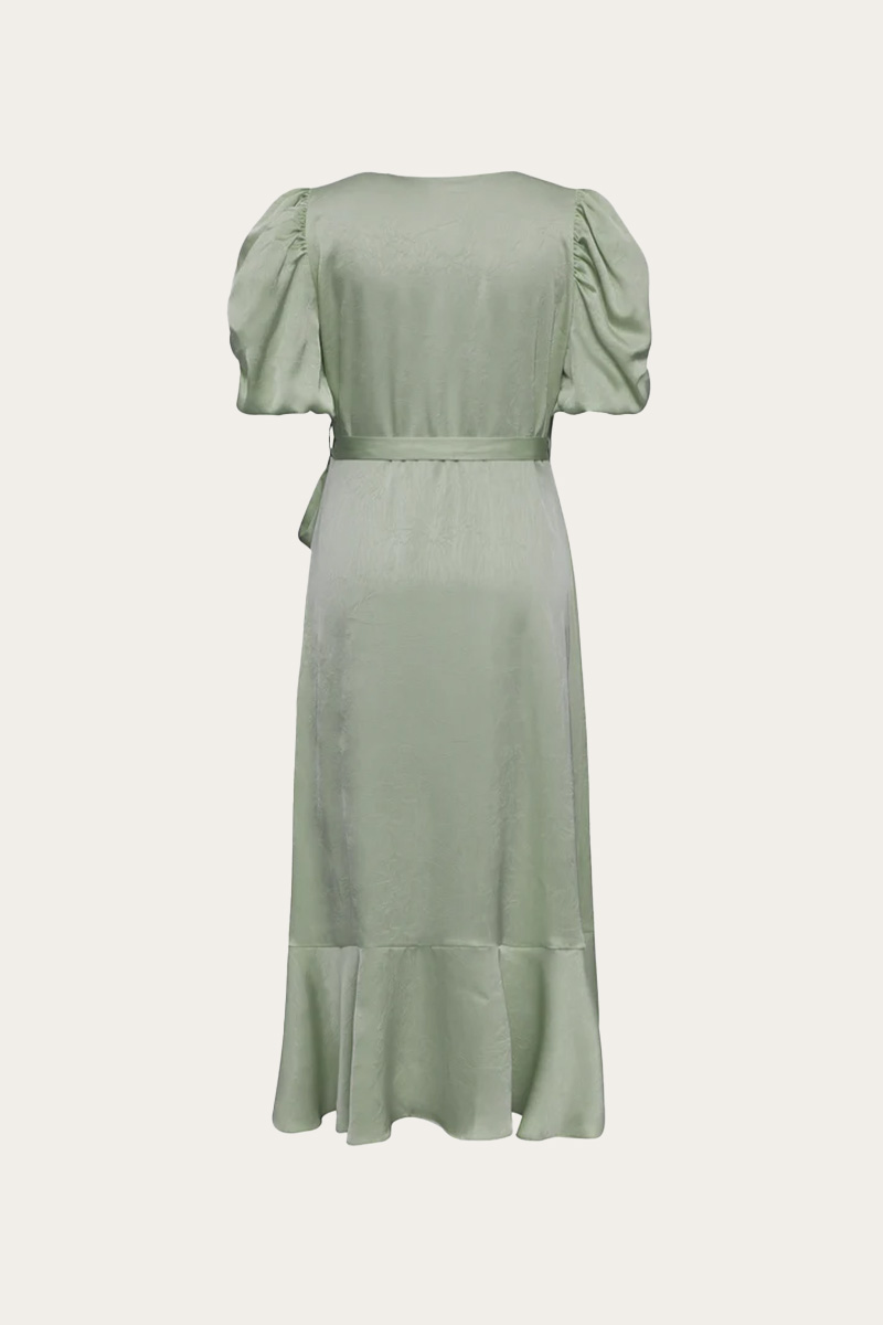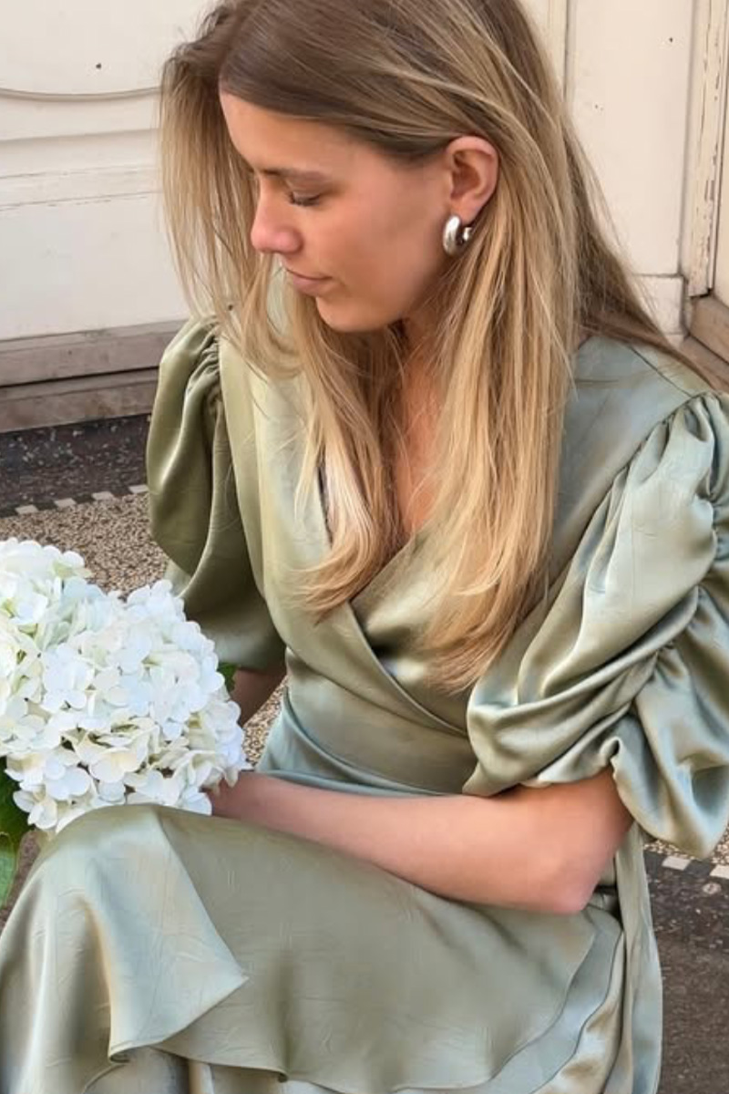 Sinda dress er en elegant omslagskjole med et glansfullt satinpreg og et feminint uttrykk. Den asymmetriske volangkanten og de puffede ermene gir kjolen en lett og sofistikert silhuett, perfekt til både fest og spesielle anledninger.