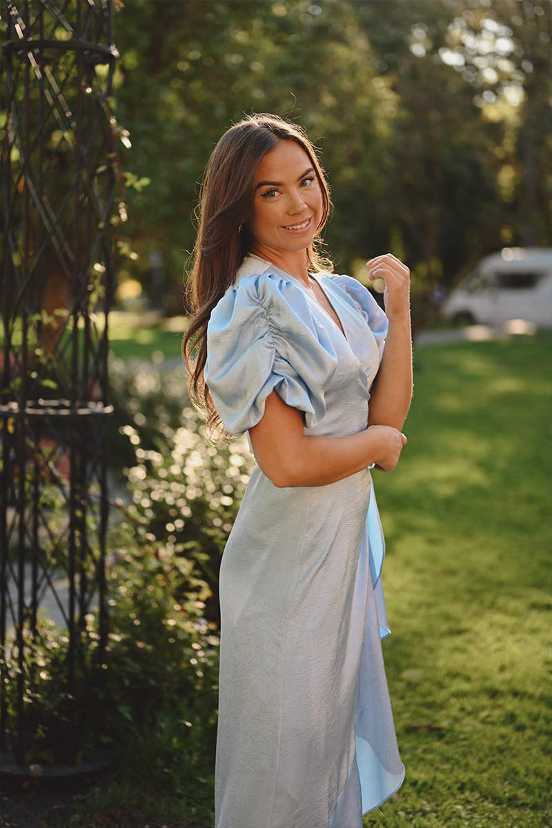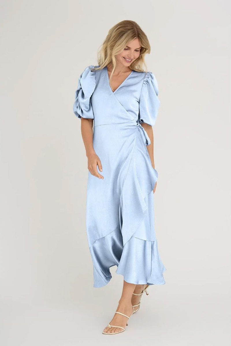 Sinda Dress fra A-View er en elegant omslagskjole i nydelig satengfinish og i lys blå farge. Med puffermer og a-symmetriske volanger, gir den det perfekte feminine snittet mange ser etter i en feminin selskapskjole.