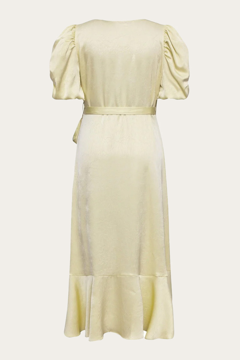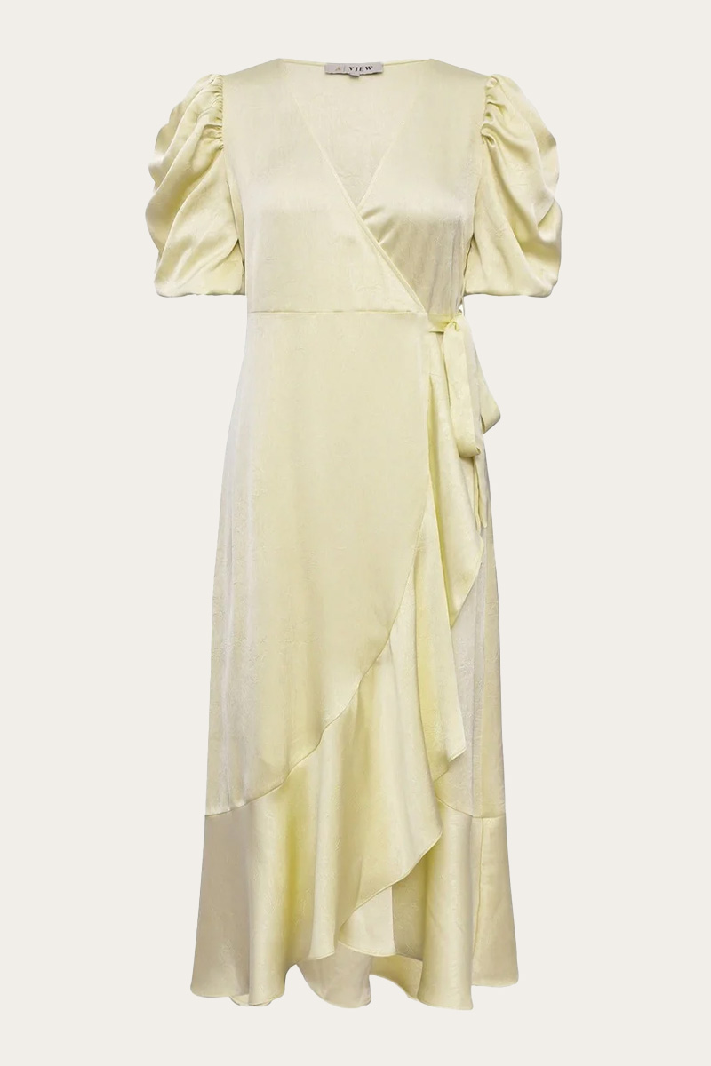 Sinda Dress fra A-View er en elegant omslagskjole i nydelig satengfinish og i lys gul farge. Med puffermer og a-symmetriske volanger, gir den det perfekte feminine snittet mange ser etter i en feminin selskapskjole.