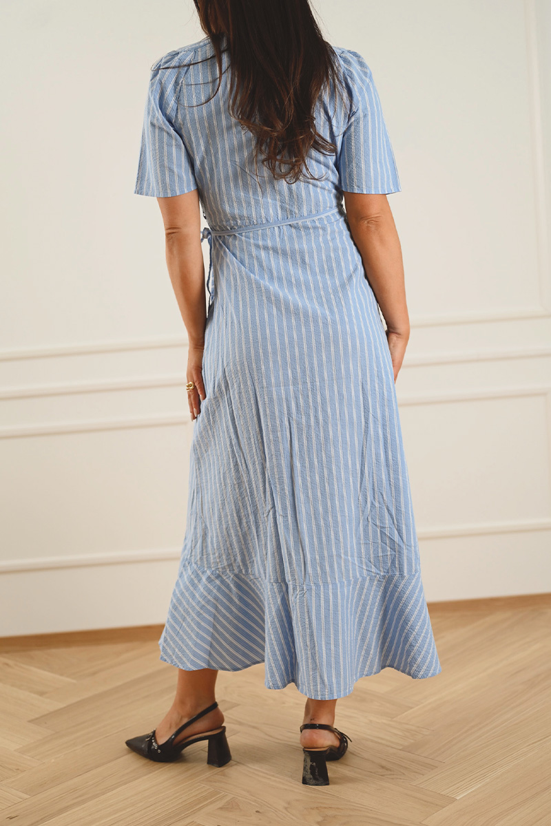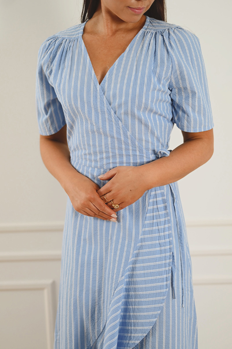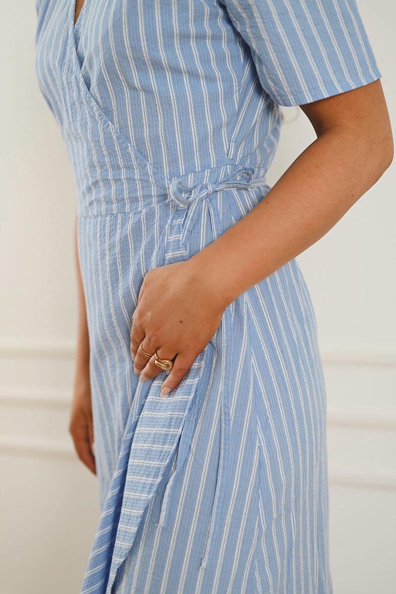 SLAnvitte Karven er en tidløs og feminin kjole i beige med sorte striper fra Soaked in Luxury. Modellen har en flatterende V-utringning, korte ermer og en omslagsinspirert front med knyting i siden som markerer midjen. Det asymmetriske skjørtet gir et lett og elegant fall – perfekt til både hverdag og sommerens anledninger.