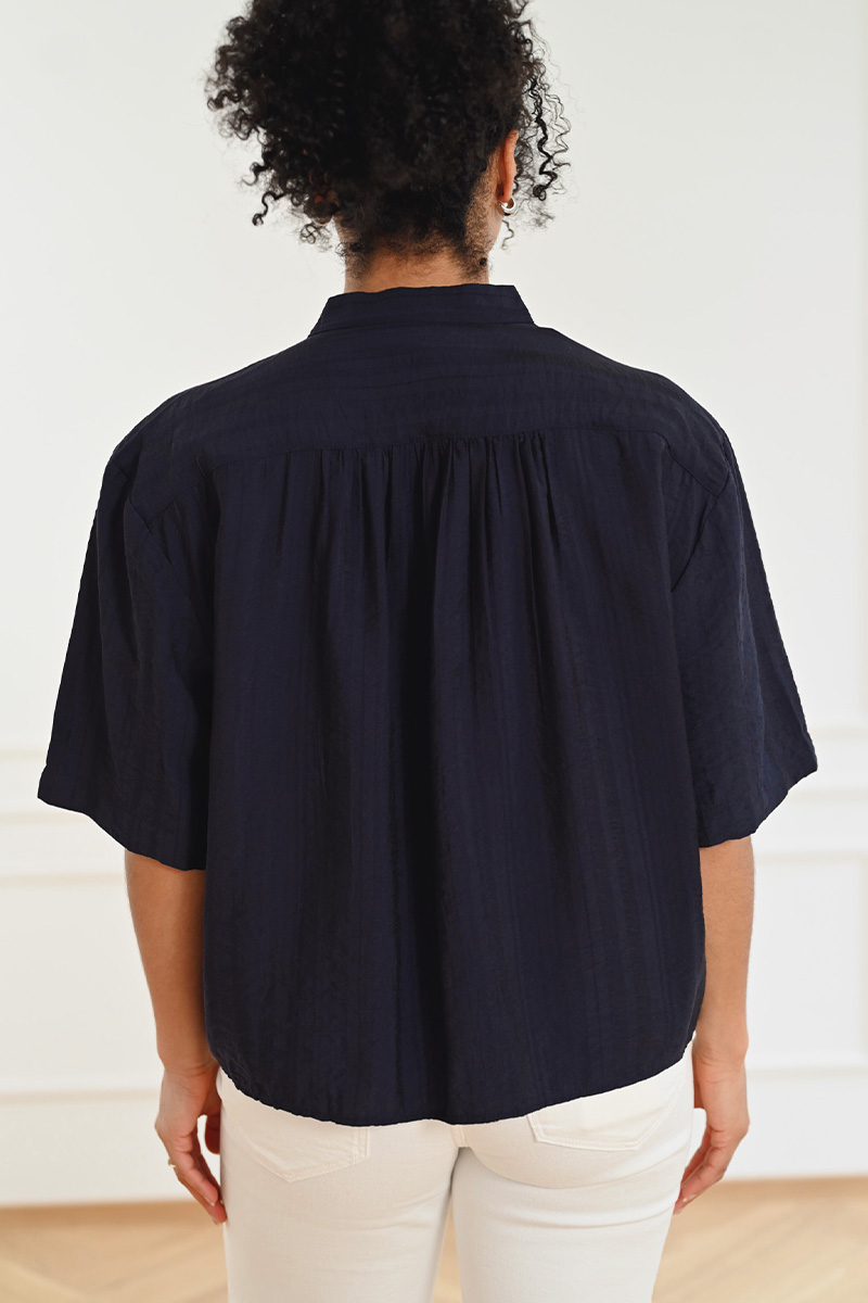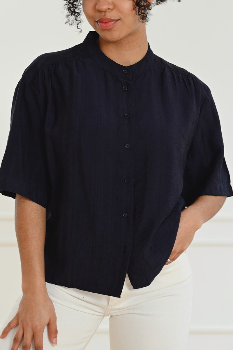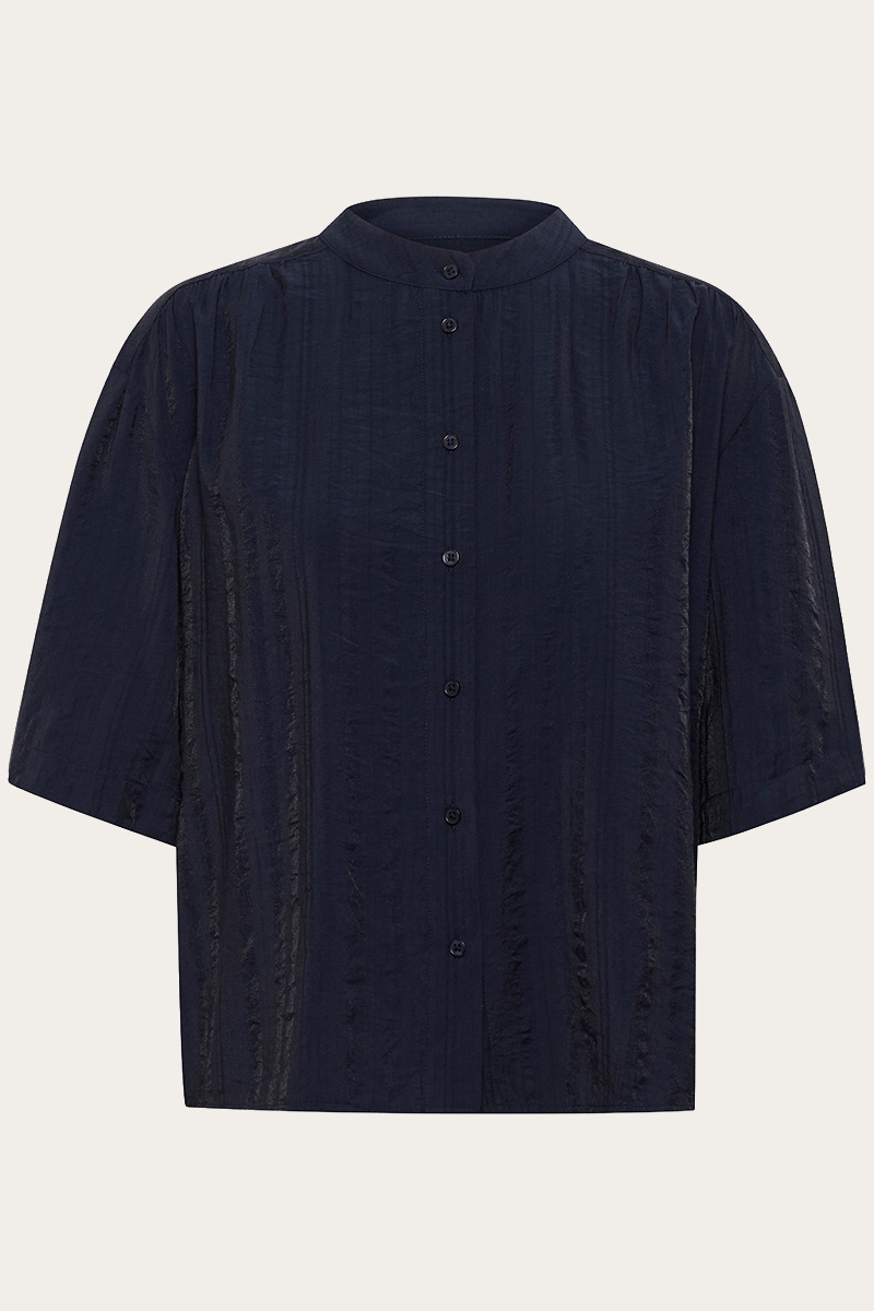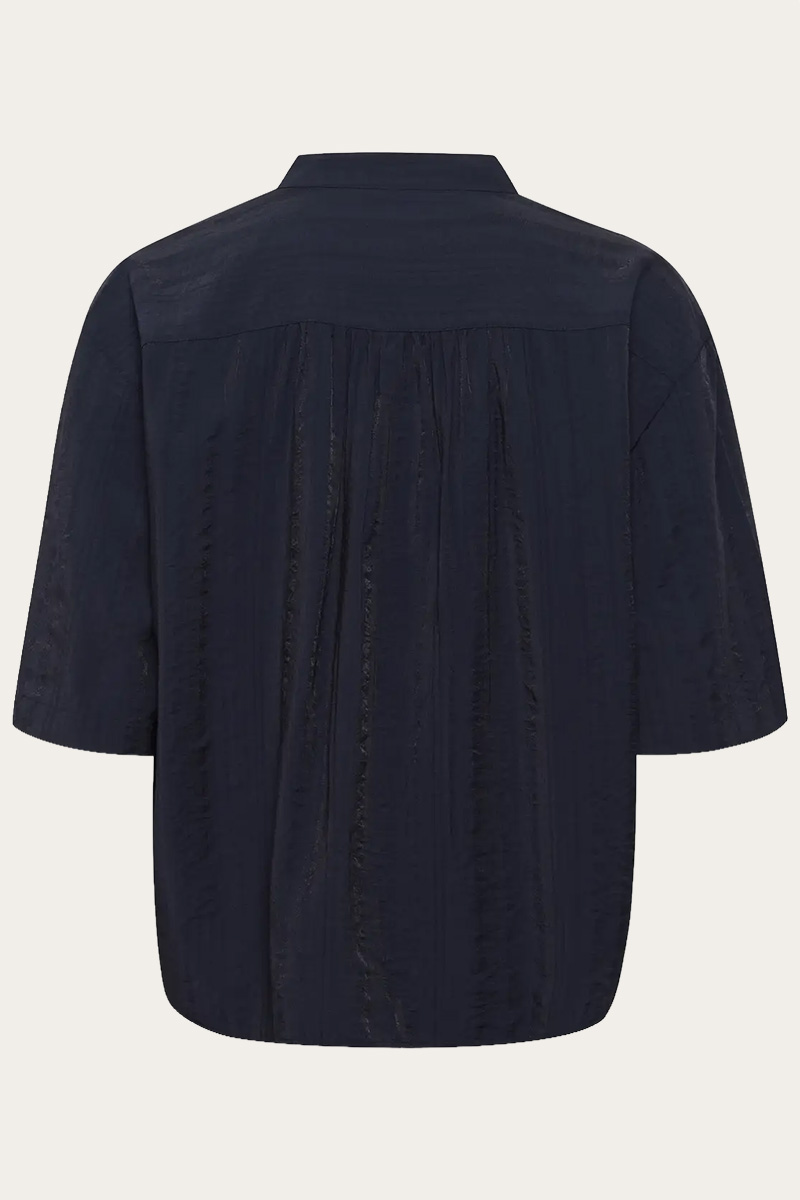SLEMINE Layna Shirt fra Soaked in Luxury i mørkeblå, er en lett og moderne skjorte som kombinerer komfort med et stilrent uttrykk. Den har korte, vide ermer, knappelukking i front og en enkel, ren halsutringning som gir et minimalistisk preg. Den dype blå Night Sky-fargen gjør den enkel å style – perfekt både til jobb og hverdags.