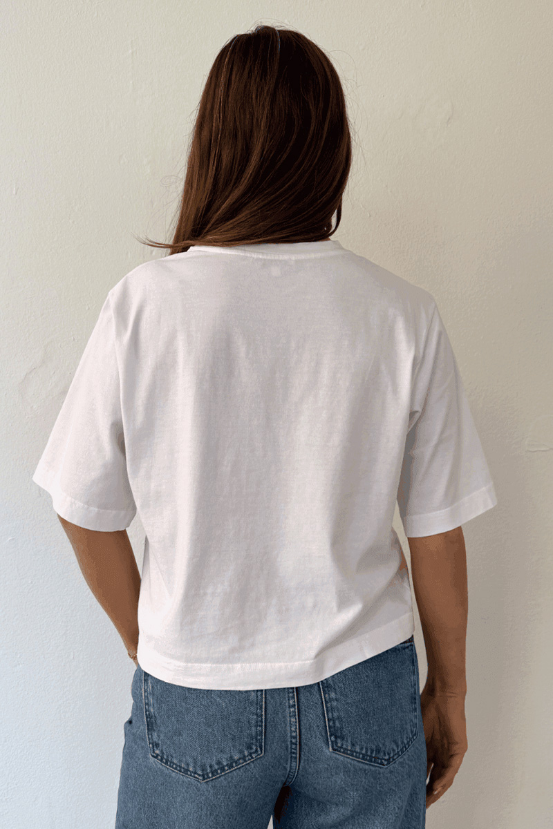 Stampe t-shirt er en avslappet og moderne t-skjorte med et lett cropped uttrykk. Den løse passformen og de litt lengre ermene gir en kul silhuett som passer perfekt til både jeans, shorts eller skjørt.