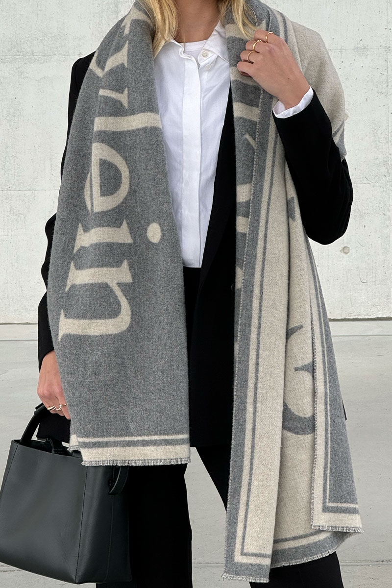 Stort og deilig signaturskjerf fra Stylein i tidløs gråtone med beige kontraster. I tillegg to store logoer sentrert på hver side. Thalia Scarf er laget i en herlig og myk ullblanding som holder godt på varmen. Style med din favoritt-jakke på kalde høst- og vinterdager! Thalia Scarf finner du i et utvalg Companysbutikker i tillegg til på Companys.no