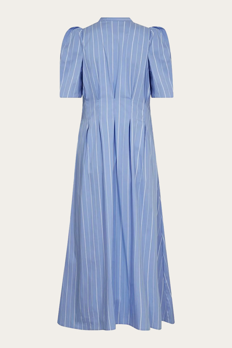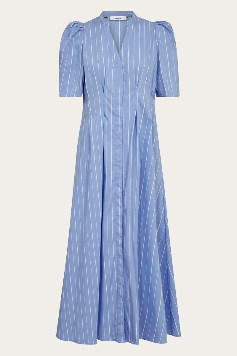 TeranCC Stripe Pleat Dress Pale Blue fra Co’Couture er en feminin og tidløs skjortekjole i lyseblå med delikate hvite pinstripes. Modellen har gjennomgående knappelukking, lett puff ved skuldrene og flatterende sømdetaljer som former silhuetten på en elegant måte. Ermene har komfortabel vidde, og den strukturert-lette poplinkvaliteten sørger for et pent og velkledd uttrykk til både jobb og fritid.
