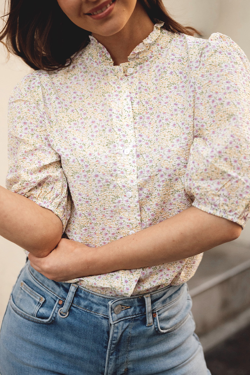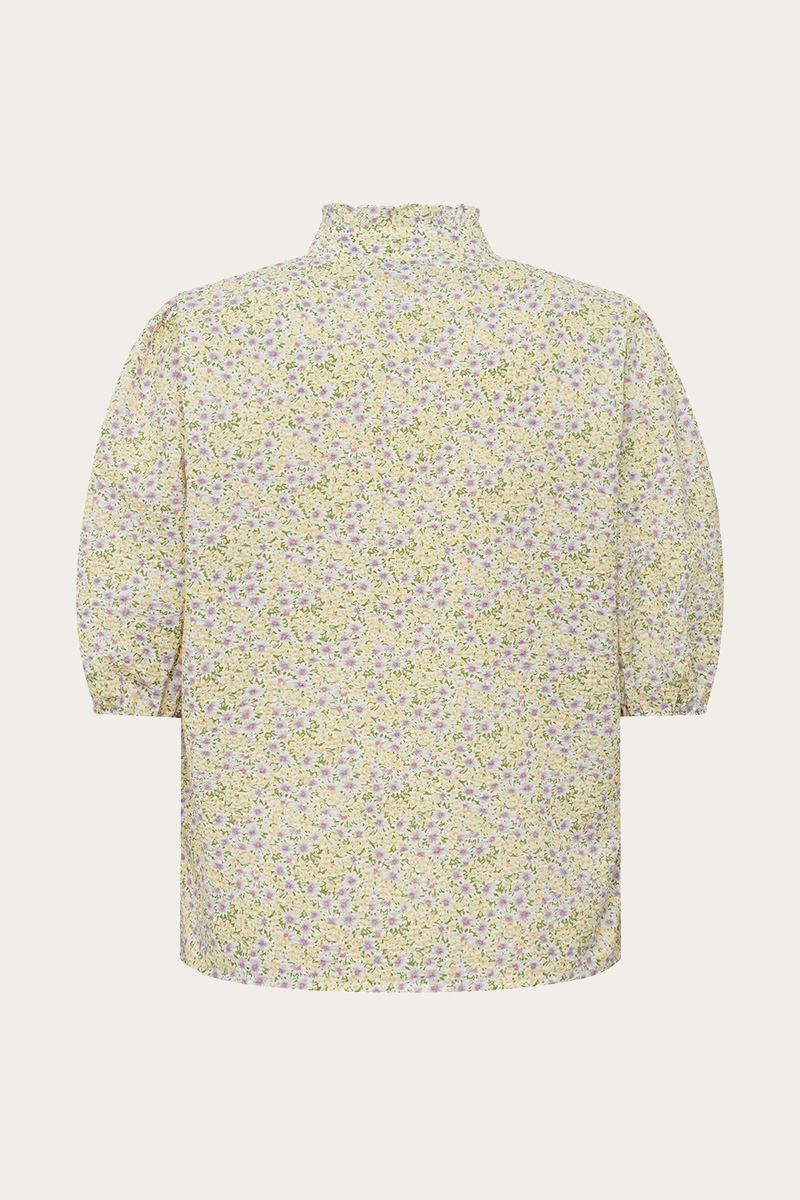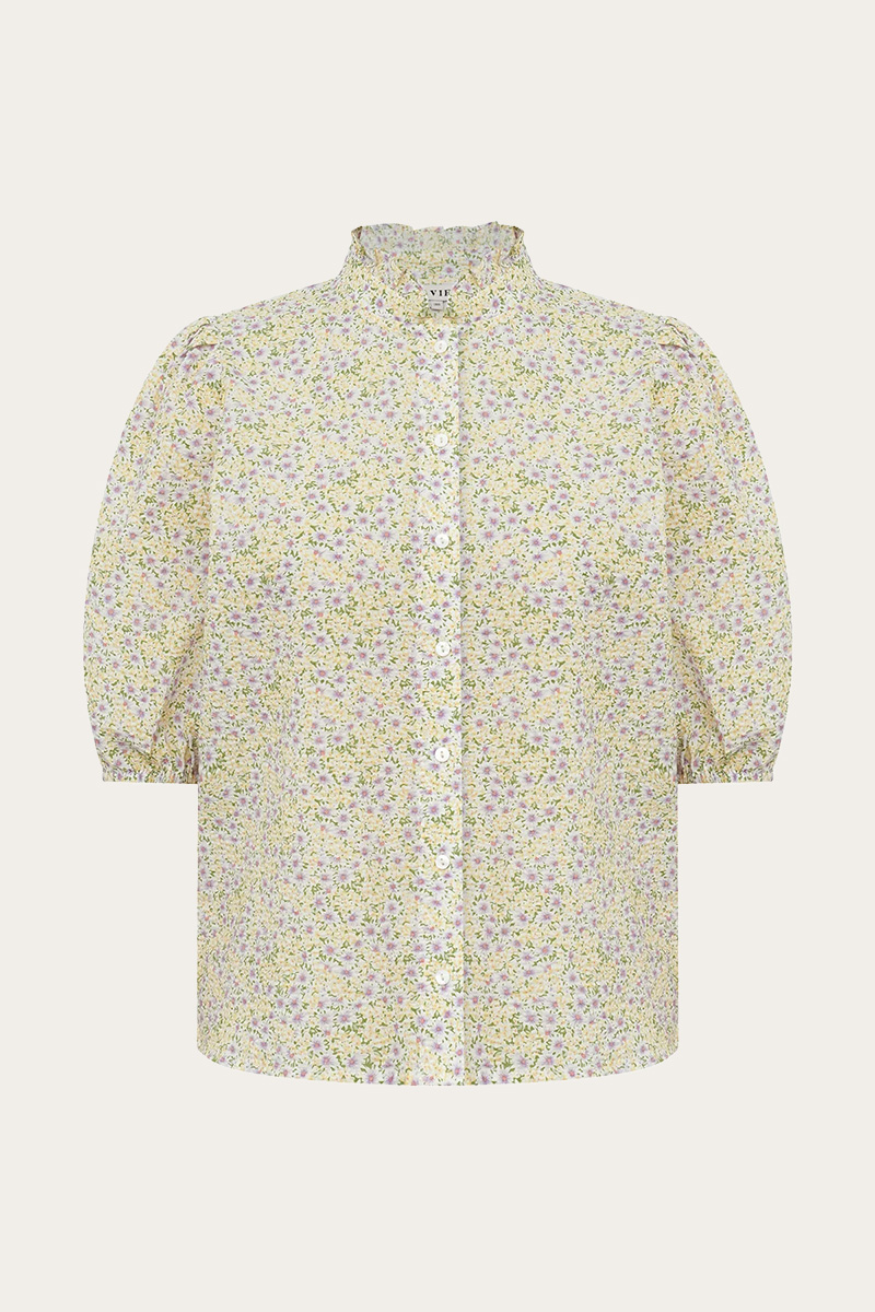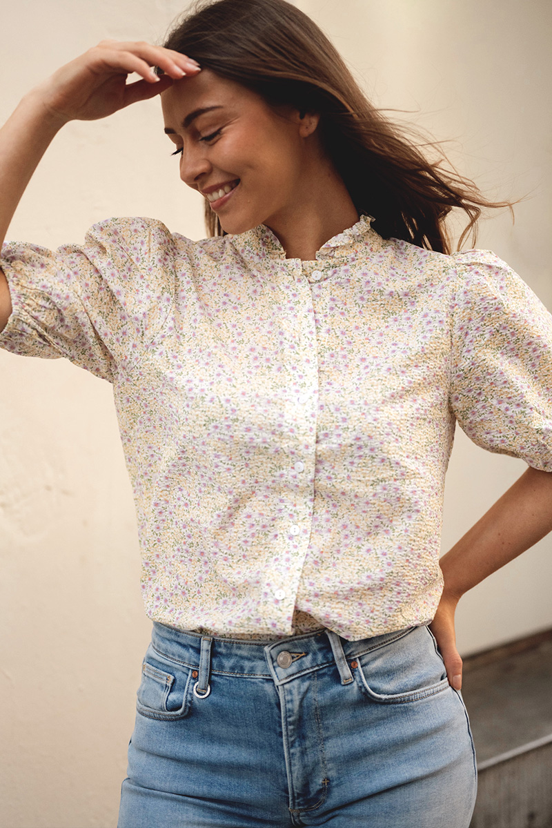 Tiffany shirt er en feminin skjorte med et vakkert blomsterprint og en dekorativ flæsekrage. Den løse passformen og de let ballongformede ermene gir et mykt og elegant uttrykk, perfekt til både hverdags og mer pyntede antrekk.